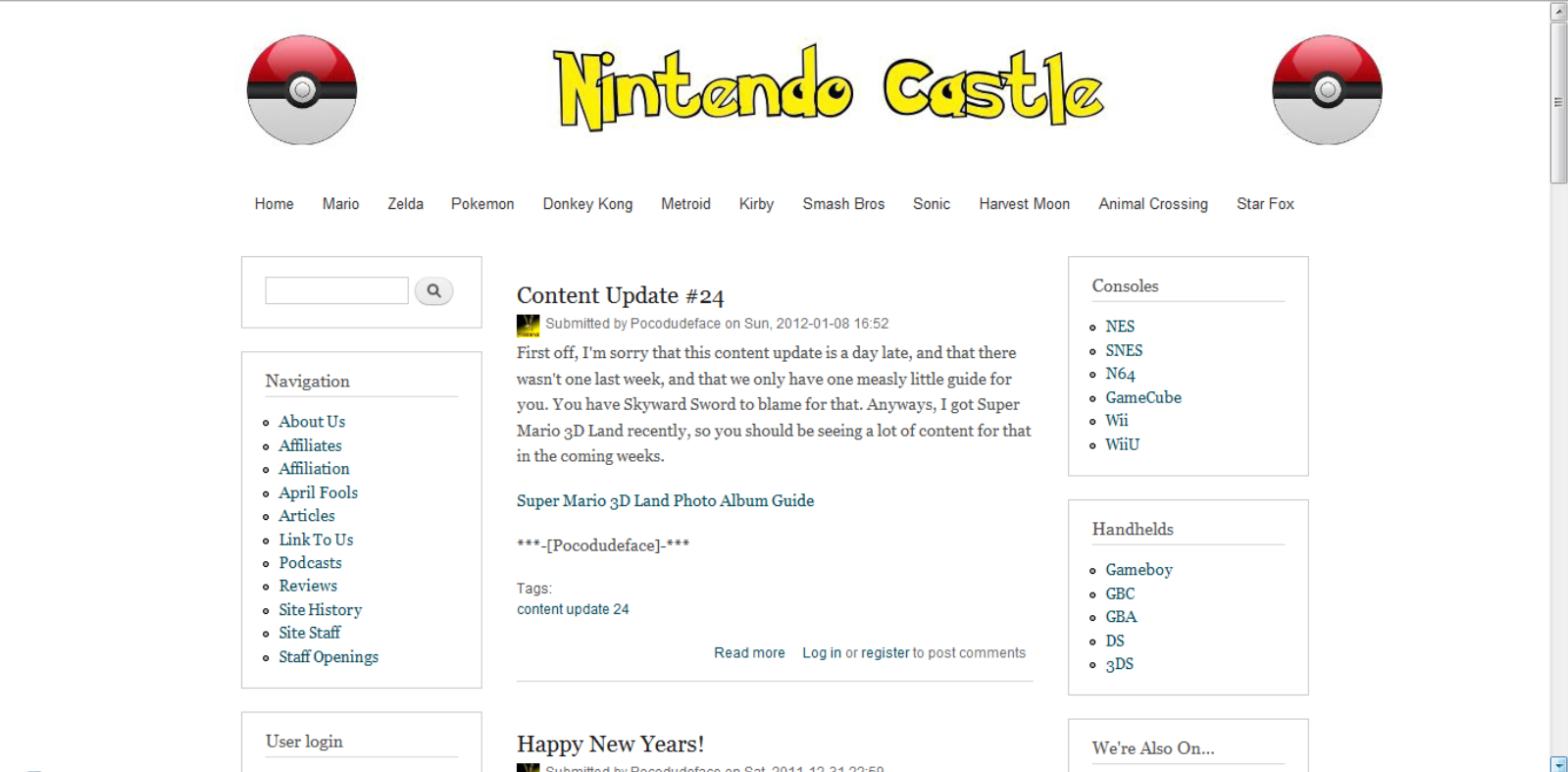 After two weeks of downtime, Nintendo Castle Version 3.0 is ready. Our fourth CMS, Wordpress, is now in use. Pocodudeface and Iamthefusedshadows set most of the site up, while Nick of Zelda Eternity designs most of the graphics. It was a button-centered theme, and featured a large right sidebar. The webmasters continue to update the content on a semi-regular schedule. News posts range from daily to monthly. Podcasts are released monthly, but start to fade out. A few new staff members join the crew: namely DodongoBomber, Bigflyingpotato, PotassiumIodide, and Larke12. All three have connections to Zelda Eternity and make minor contributions for a while, including participating in the podcast.