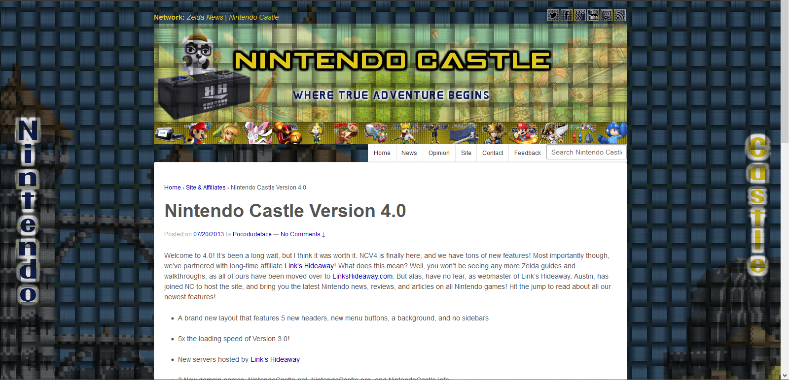 After some on and off downtime, Version 4 of Nintendo Castle launches on July 20th 2013. Version 4 is by far the best the site has ever looked. It features a sleek, graphic-rich design with no sidebars. All graphic design, coding, and debug was done by staff member Larke12, under the direction of Pocodudeface. Version 4 is also the beginning of a partnership between Link's Hideaway and Nintendo Castle. All Legend of Zelda content is transferred to LH, and it's webmaster Autydi joins Nintendo Castle as a Webmaster. In addition to this new partnership, a joint forum is created for the two sites. Komodo_Zero joins the team as head forum administrator and content writer. After some trial and error, the forum launches on August 15, 2014. Forum activity is promising at first, but quickly dwindles to a few active members posting infrequently.