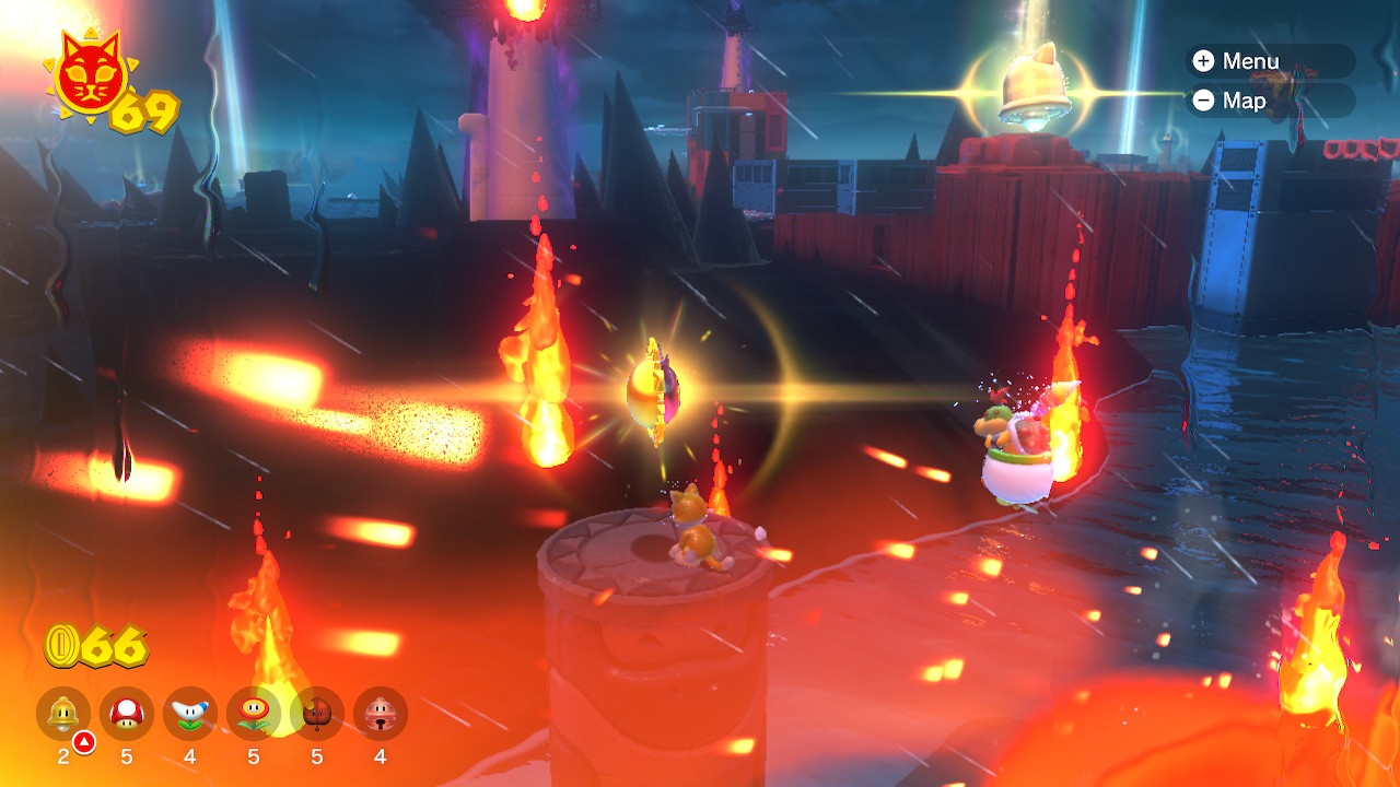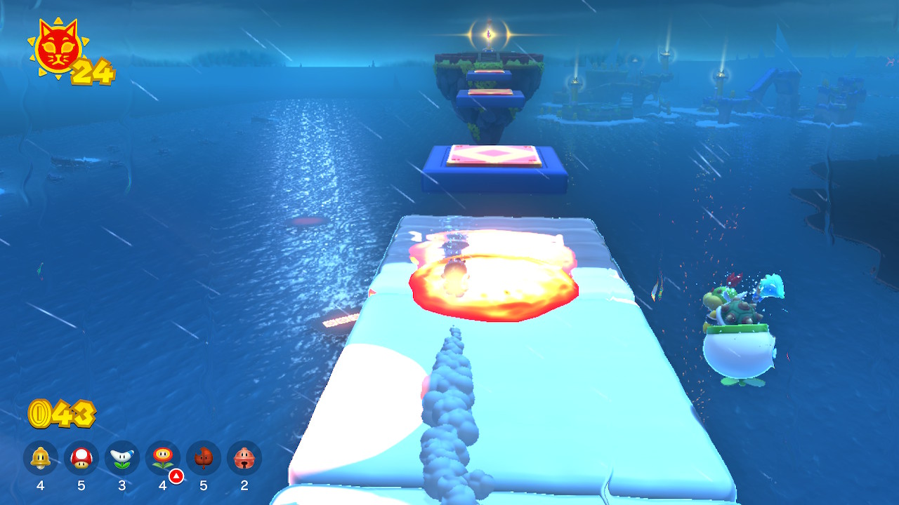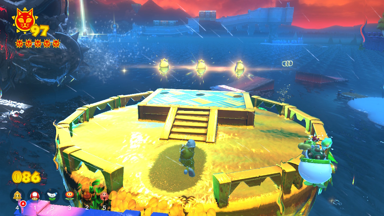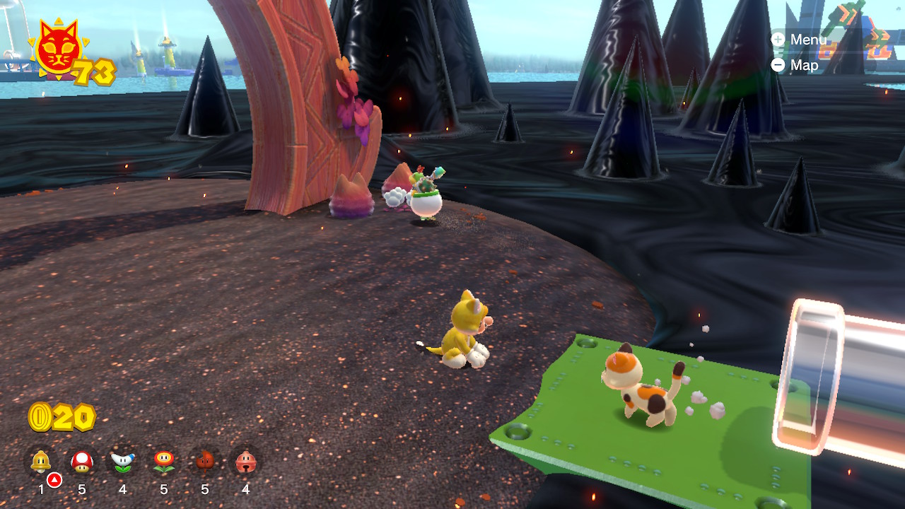 The following Cat Shines can only be collected after beating the game. To beat the game, defeat Fury Bowser after unlocking all areas and gathering 50 Cat Shines.