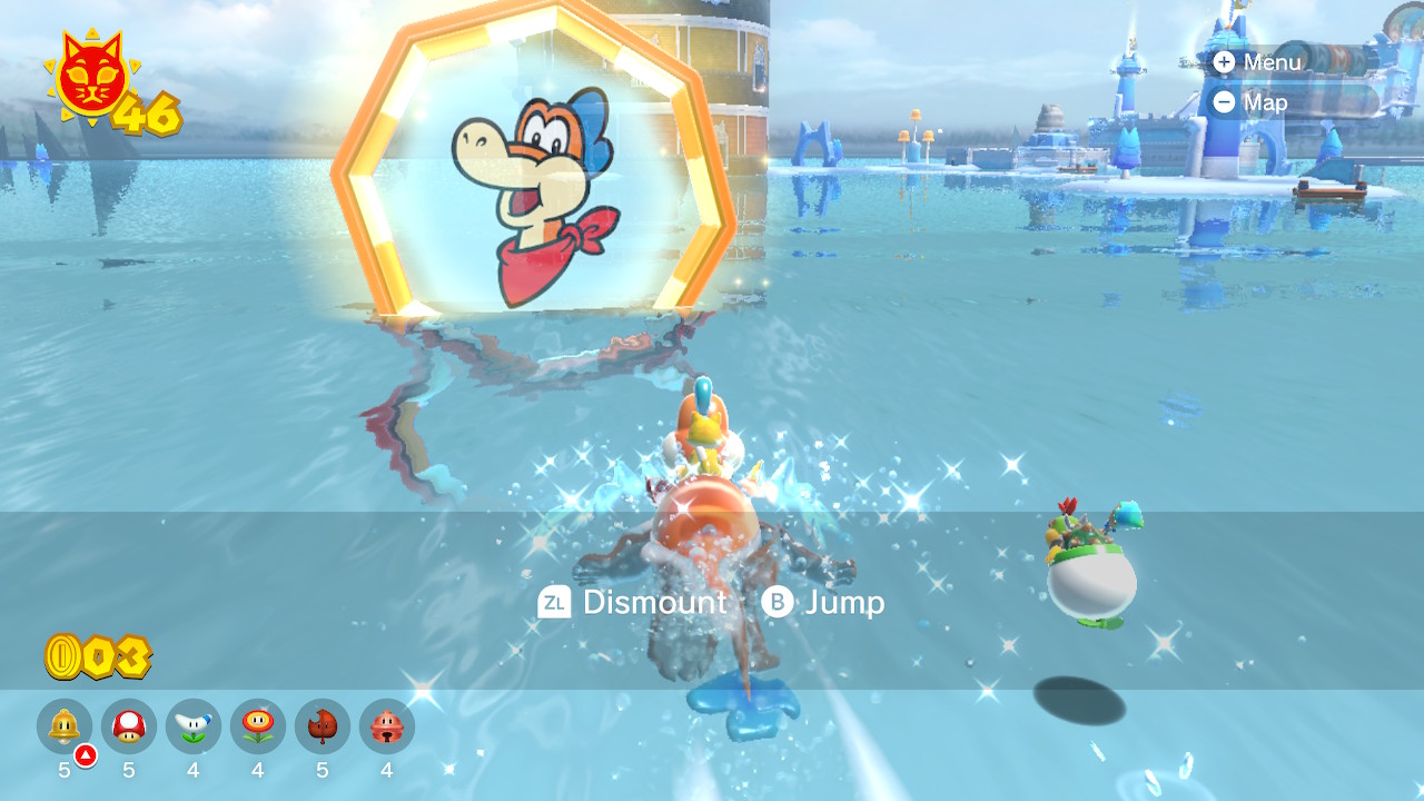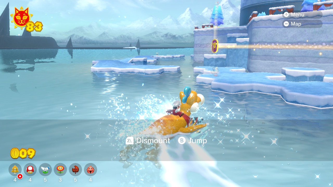 Take Plessie due left of Pounce Bounce Isle to the falls. There is a small island here with a purple switch. Hit it to erect a small course that leads you to Cat Shine #14. You can use Cat Mario to scale the center very quickly to make it easier.