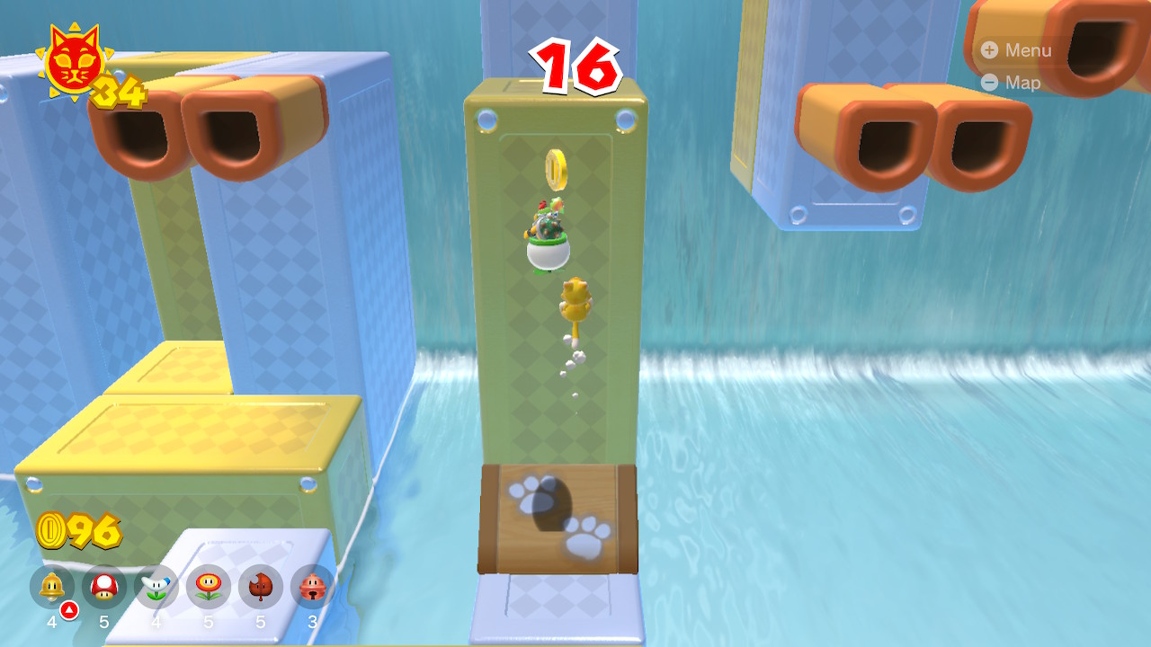On the rear side of Pipe Path Tower you can use the clear pipe to jump down onto the rock wall that extends towards Fury Bowser and the waterfall. Run along this wall and long jump over the gaps (or use Cat Mario). At the end of the wall you'll find Cat Shine #17.