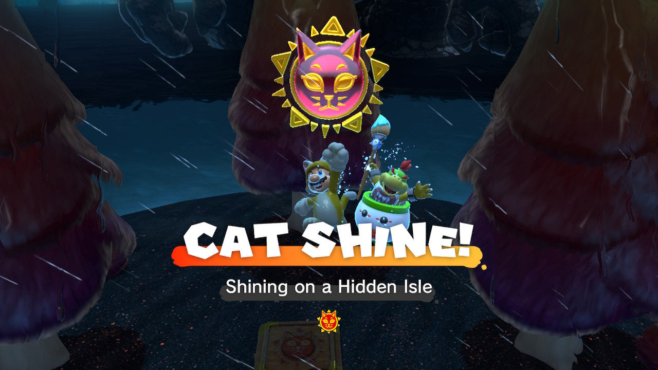 During Bowser's Fury, hop onto Plessie near Trickity Tower and follow the golden rings to the ship ramp. Keep following the golden rings and you'll eventually get to a jump that goes over the black goop to Hidden Isle. Here you'll find Cat Shine #15.