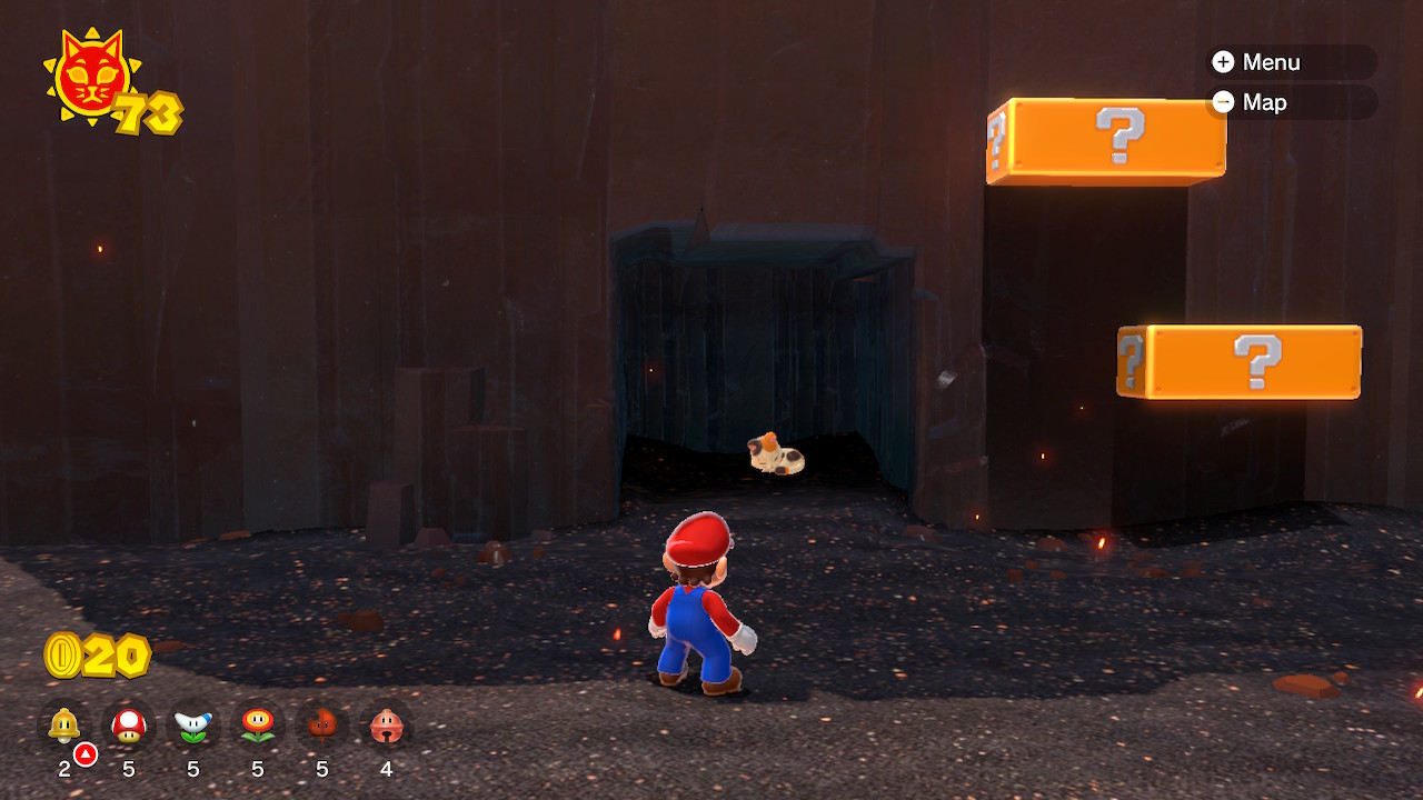 Near the Wasteland Giga Bell is another mother cat sad about her five lost kittens. The first can be found on the left side of the wasteland near the entrance to Risky Whisker Island. The second can be found in an alcove below the main Risky Whisker Island platform. Grab this one and use the hidden ? Blocks to the right to scale to the top of the platform.