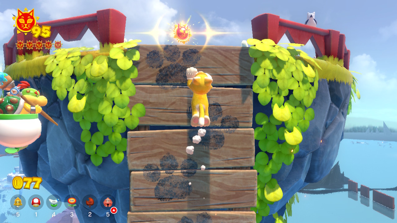 There is a small island to the right of the Ruins Giga Bell. Use Cat Mario to scale the trees here and you'll find a cloud pipe that send you to an area in the clouds. Defeat all the enemies here using the Power Stars and you'll get Cat Shine #9.