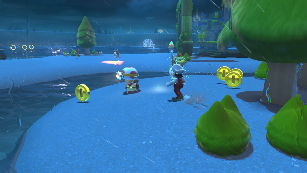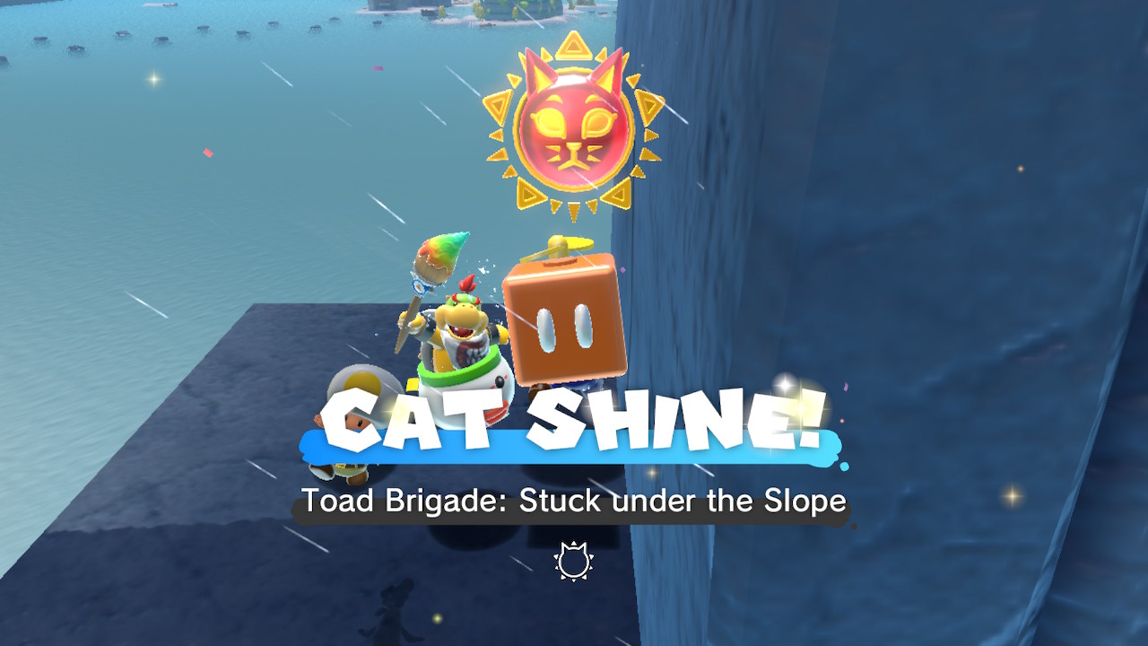 After beating the game, make your way to the top of the slope in Slipskate Slope. Grab a Propeller Hat here. Near the beinning of the slope, after the first drop down, jump off the side and use the propeller hat to reach a ledge under the area. Here you'll find a toad awaiting your rescue. Your reward will be Cat Shine #33.