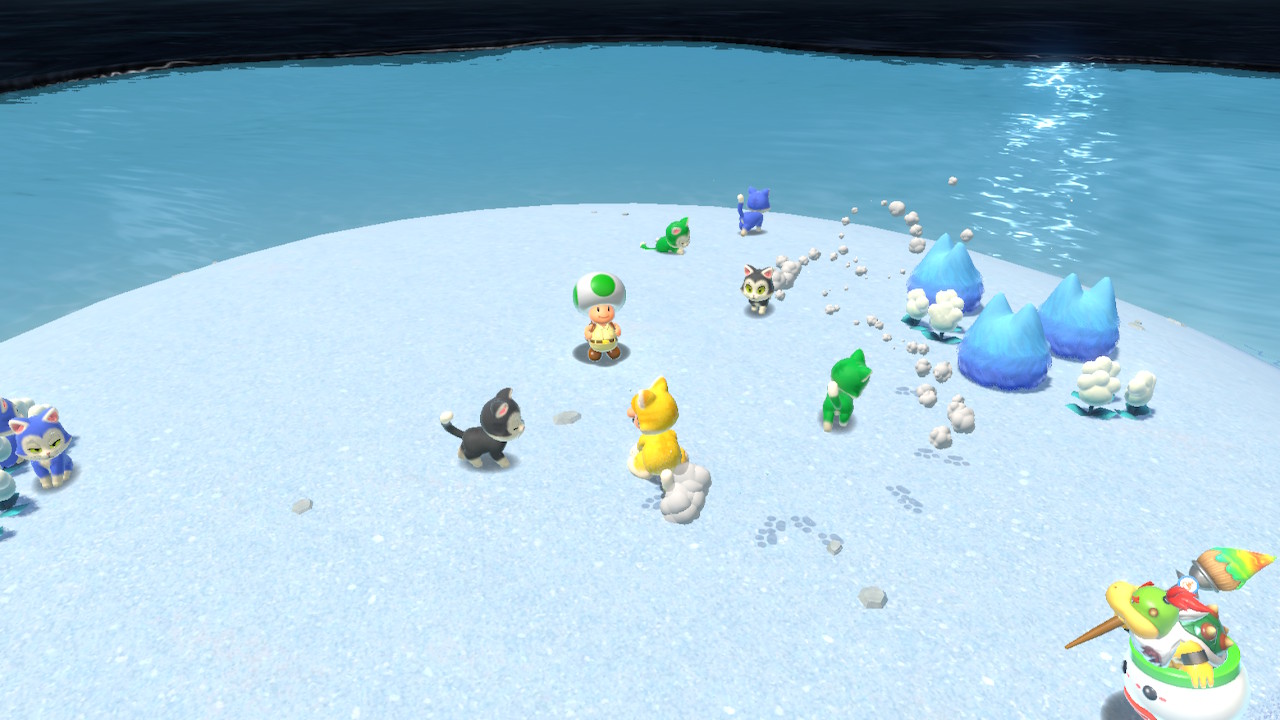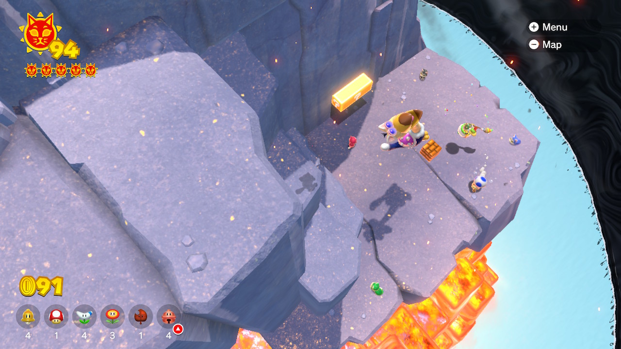 After beating the game, make your way to the top of Mount Magmeow. At the very top, you can drop down to a slightly lower platform to the left. Here you'll find a blue toad being attacked by an enemy. Rescue him to get Cat Shine #35.