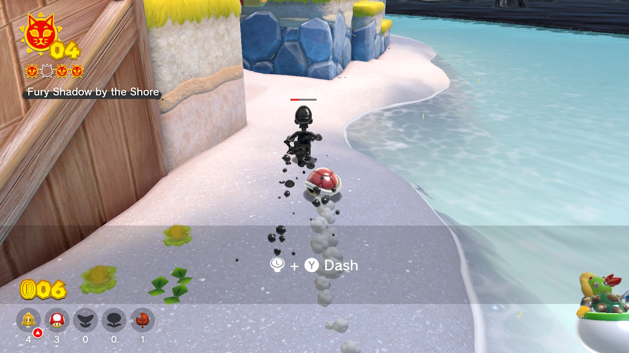 Head back to Scamper Shores after leaving to find Shadow Luigi taunting you. Chase him around the level and deal damage by jumping on his head, swiping at him with Cat Mario, or using various items. Once he's defeated, you'll get Cat Shine #2.