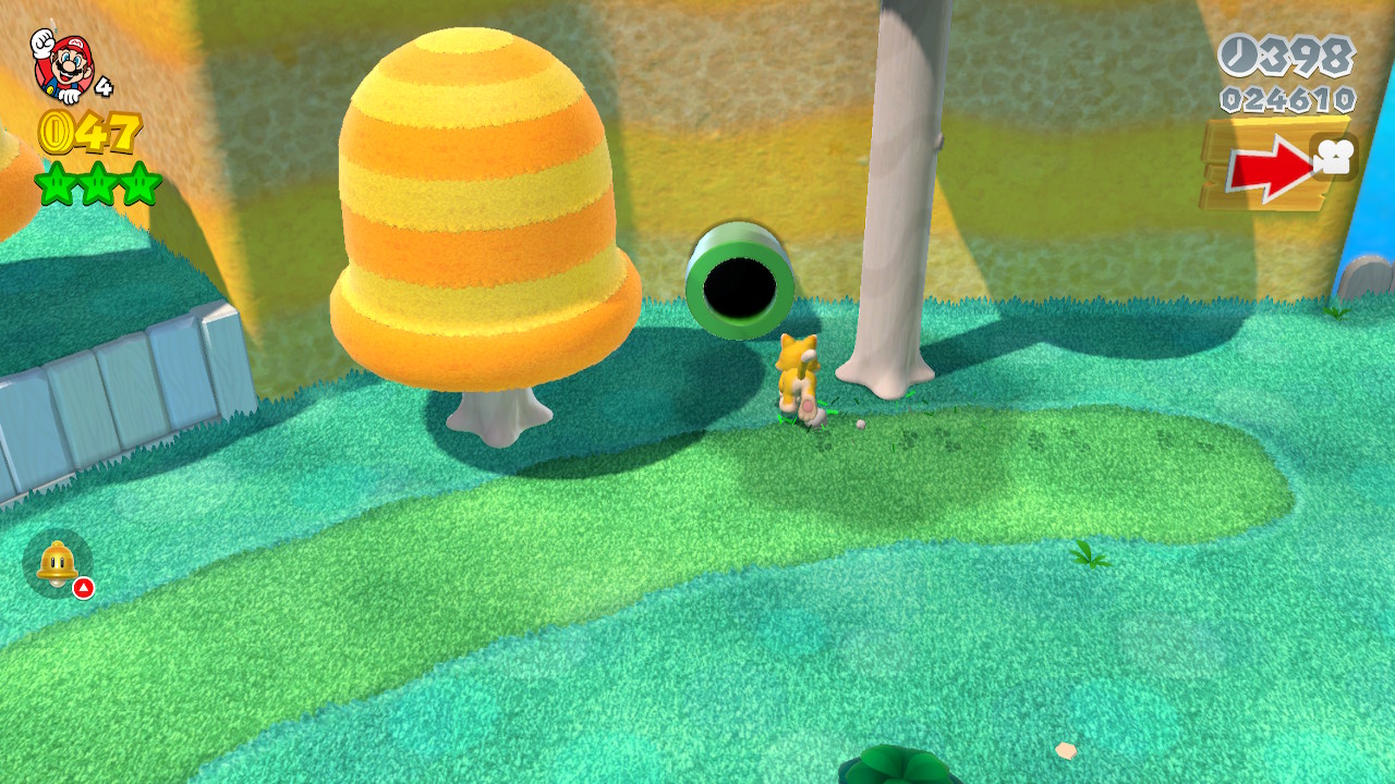 You can find the World 1-3 Stamp between two cliffs in the mountain face. It can be gathered by wall-jumping, climbing with a cat suit, or dropping down from above.