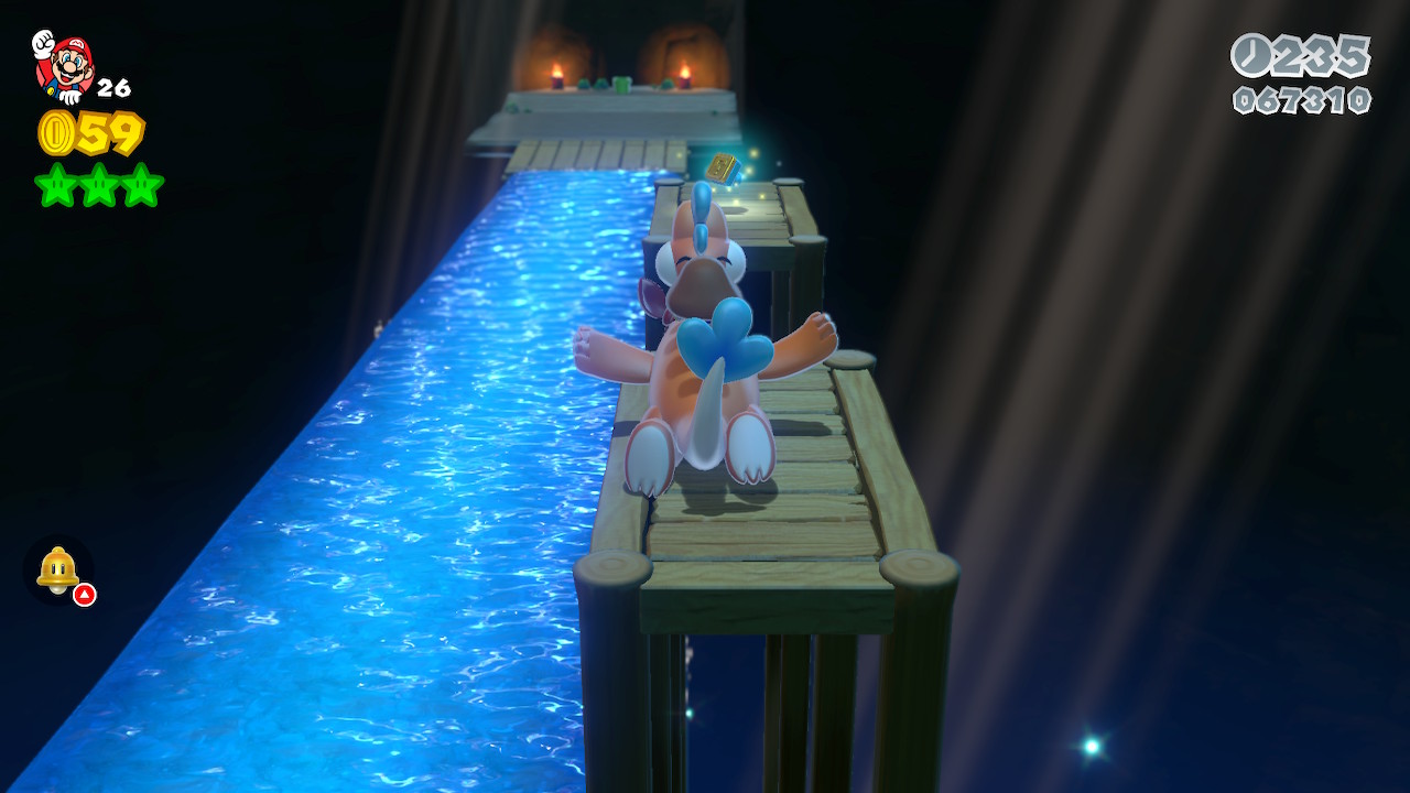 Using at least two characters, get on the platform before the flagpole and it will carry you to the World 5-6 Stamp. There is a Double Cherry in the ? block above the right electric ring enemy.