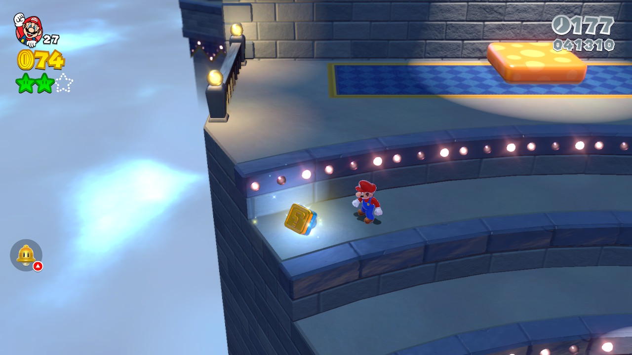 The World 5-7 Stamp is floating above a row of brick blocks. Try to avoid the spotlight when you grab it.