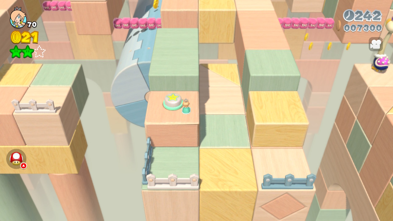 While using the first Mega Mushroom, jump up and break the grey blocks before dropping down into the lower area. The World Star-7 Stamp is protected by these grey blocks.