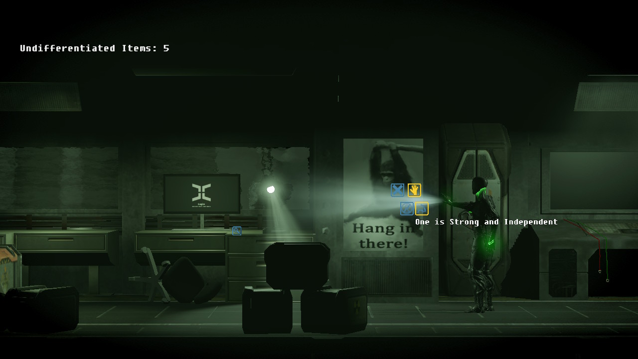 Switch back to the One's perspective and use "One is not Pathetic" on the body in the bag to the right. Use "One is not Levi" on the sign in the window. Repeat this step using the Companion's perspective. Switch back to the One's perspective and use "One is Strong and Independent" on the motivational poster to the left. Further to the left, use the "One is Strong and Indendent" command on the items blocking the door.