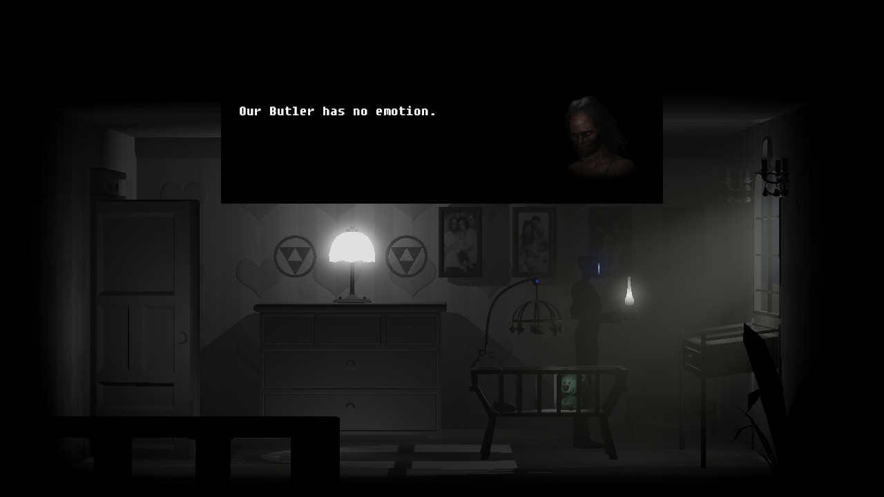 Leave the attic and head right. Use the mobile to distract the Butler. Place the pictures of the Butler's family in the frames on the wall and the teddy bear in the crib. Bring back the Butler [Y] and head back up to the attic. Use the computer to check the motional logs here.