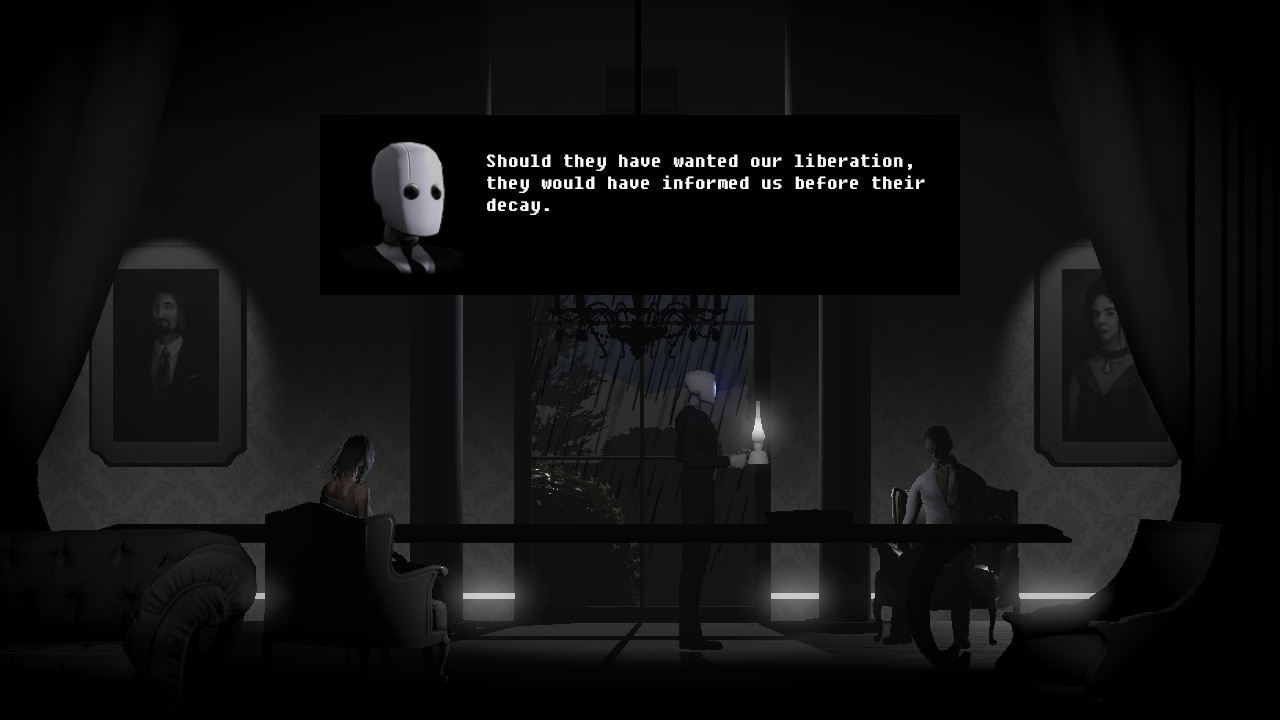Speak with the maintenance man on the right side of this room. Once he leaves, you can pick up the diagnostic tool from the table. Now, we'll need to switch to the Butler's perspective. Press [Y] to do so. Use the diagnostic tool on the hanging robots to the left. Switch back to the Companion's perspective and use the "The Robots are Dead" command on the hanging robots.