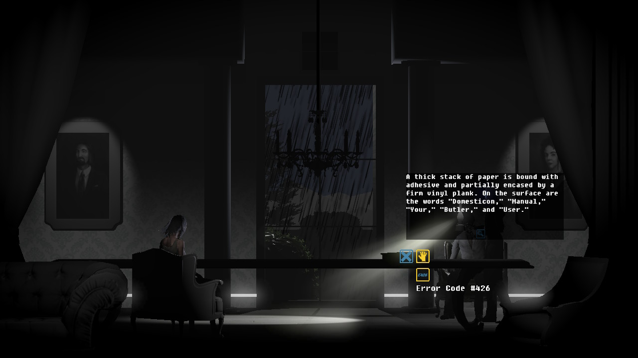 Head back downstairs and enter the room to the right. Use the diagnostics tool on the computer here. After, interact with the computer again. You'll then be able to take back control of The Butler and receive an error code. Head back left on the first floor to the table with the master and mistress. Use the error code on the book sitting on this table. You'll have some logs to read.
