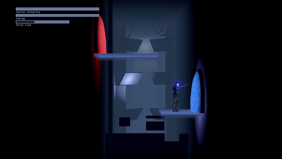 Head left, drop to the bottom floor and head right. Use the network relay here. Continue left through two rooms and you'll find some more enemies. Defeat them to increase your Viral Load. Continue left, up, and then through the door to the right. In this room, interact with the machine to spawn several enemies. The energy harnessed from defeating these enemies should be enough to fill your Viral Load. You'll now be able to fire a new dark beam (R) that can penetrate white doors.