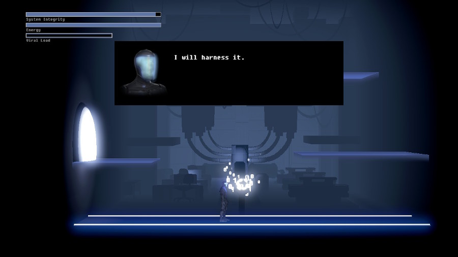 Head out of the room to the right and use the network relay to travel to a new area. Continue to the right, defeating the enemy along the way and then use the next relay. You should be at Switching Station 4. Head right through the next room and you'll run into some more enemies. Defeat them, and then choose to harness their energy and you'll get a new bar: "viral load".
