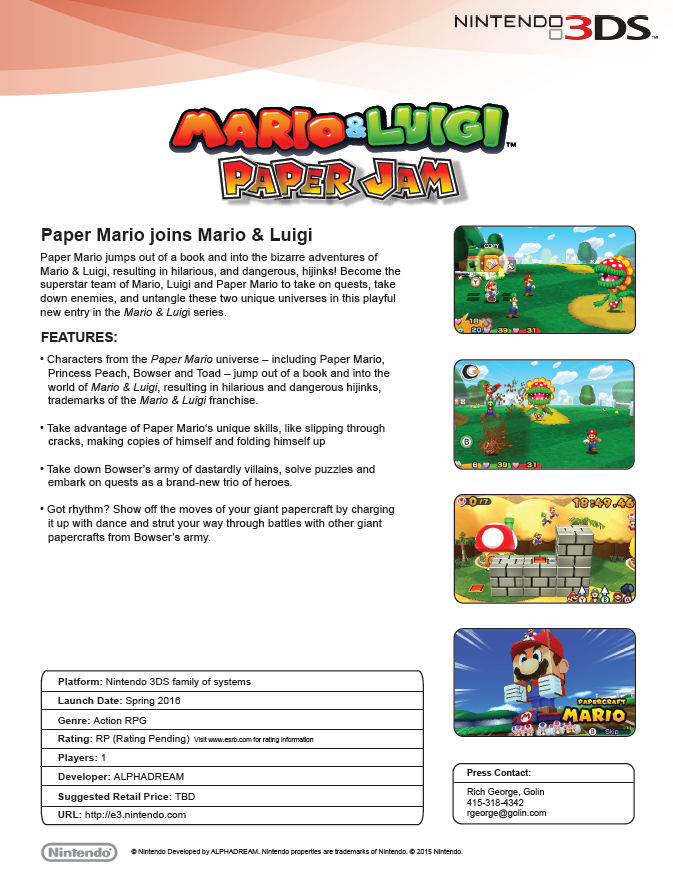 An interesting twist on both the Mario & Luigi and Paper Mario franchises was introduced today in the form of Mario & Luigi: Paper Jam. The game features Mario & Luigi teaming up with their paper forms. New features include rhythm-based giant papercraft battles and using Paper Mario's unique ability and attributes to solve puzzles. The game will come to 3DS in the Spring of 2016. Click Read More to check out the official trailer and artwork!