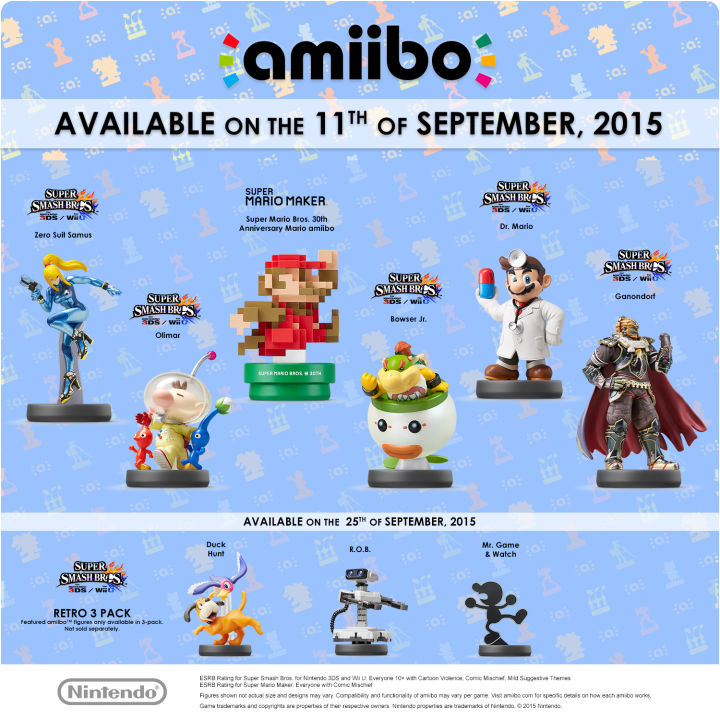 Nintendo has released the dates that some of their already announced amiibo will be hitting store shelves. This new wave of amiibo will be releasing September 11, 2015, which includes Zero Suit Samus, Olimar, Super Mario Bros. 30th Anniversary Mario amiibo, Bowser Jr, Dr. Mario, and Ganondorf. Details for the modern edition of the 30th Anniversary Mario amiibo will be launched in the future. You can find out some more about the future amiibo after the break.