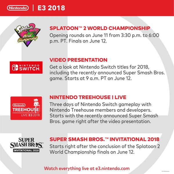 At 9 a.m. PT on Tuesday, June 12, Nintendo will debut a video presentation* featuring games releasing in 2018, including the recently announced Super Smash Bros. game for Nintendo Switch. Right after the presentation, Nintendo Treehouse: Live | E3 2018 will begin three days of live gameplay, appearances by developers and an insider look at games, starting with the upcoming Super Smash Bros. game for Nintendo Switch. Everyone can watch the video presentation and Nintendo Treehouse: Live | E3 2018 at https://e3.nintendo.com, YouTube and Twitch.