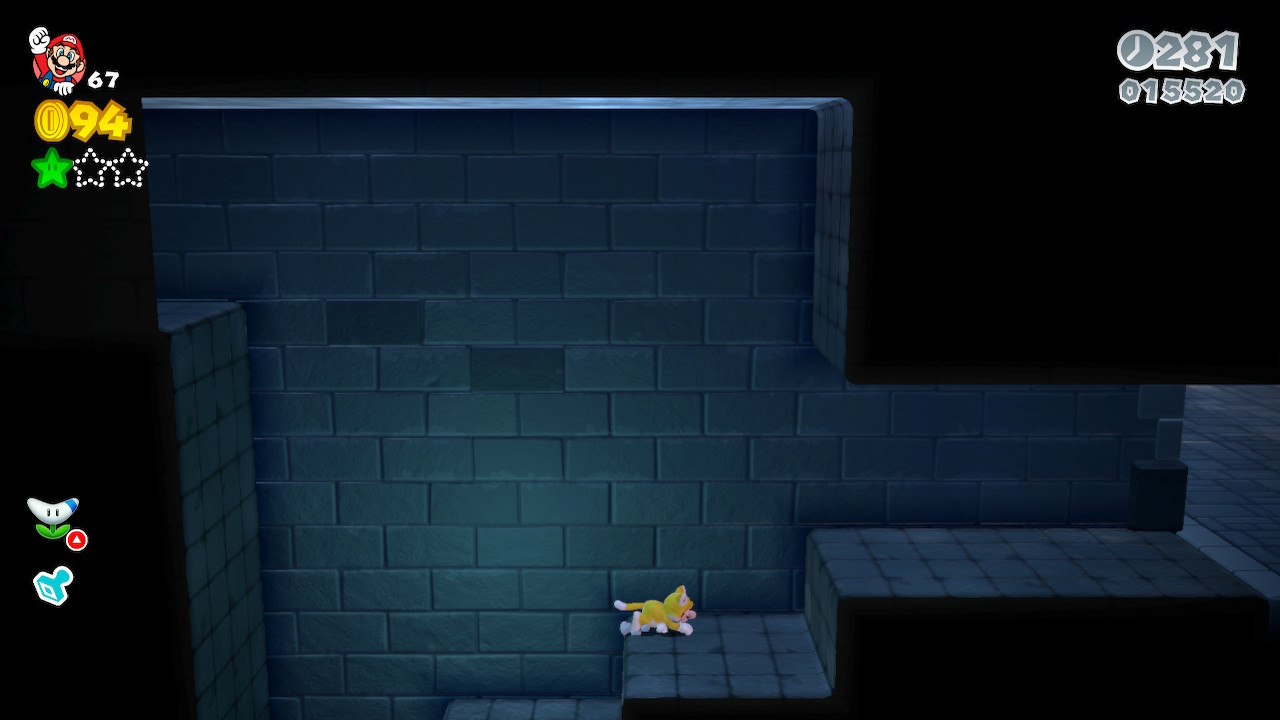 Head left after the first warp block and climb the wall using a Super Bell to find Green Star Number 1.
