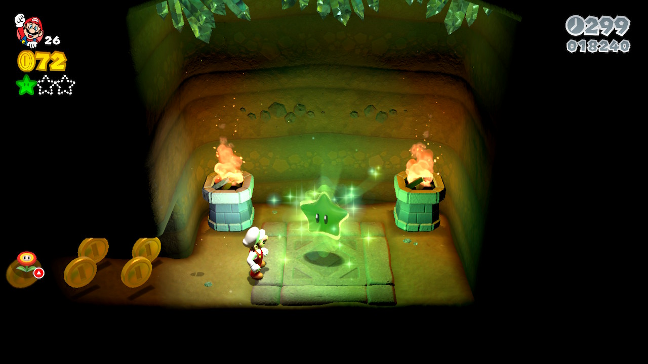Using a Fire Flower, light all four torches in the room to spawn Green Star Number 1.