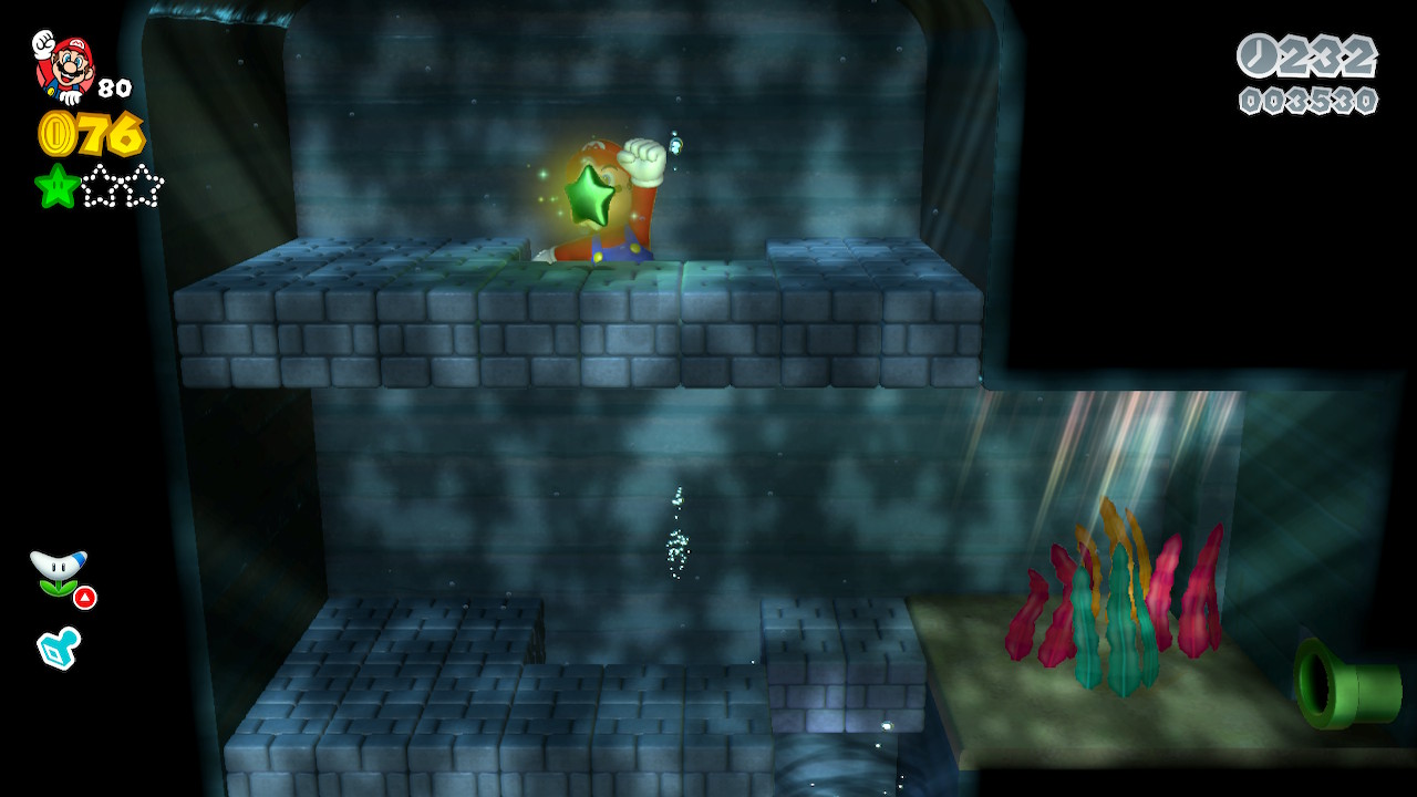 In the underwater section, blow up some blocks to reveal an alcove on the floor that contains Green Star Number 2.
