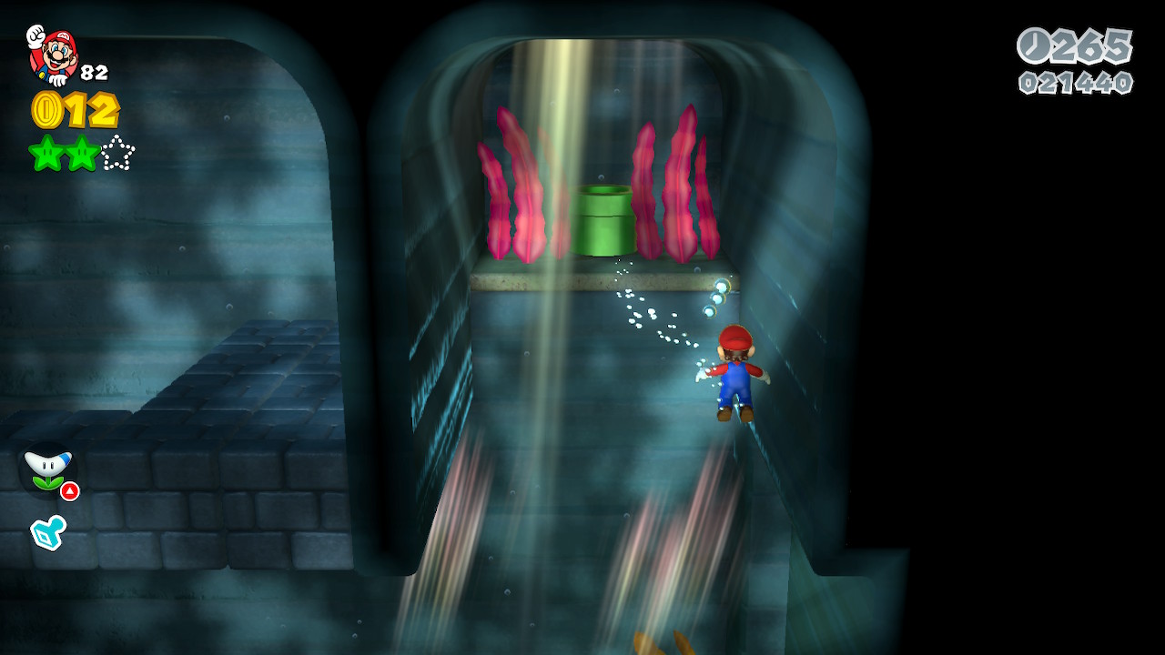 When you reach the green pipe at the end of the level, swim up to find a second hidden green pipe. Use the Mega Mushroom to collect all the blue coins in this room and get Green Star Number 3.