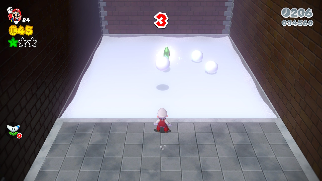 Grab a snowball before entering the area where the path sinks down into the fog. You'll come across Green Star Number 3 to the left of the path and you can throw a snowball at it to collect it.